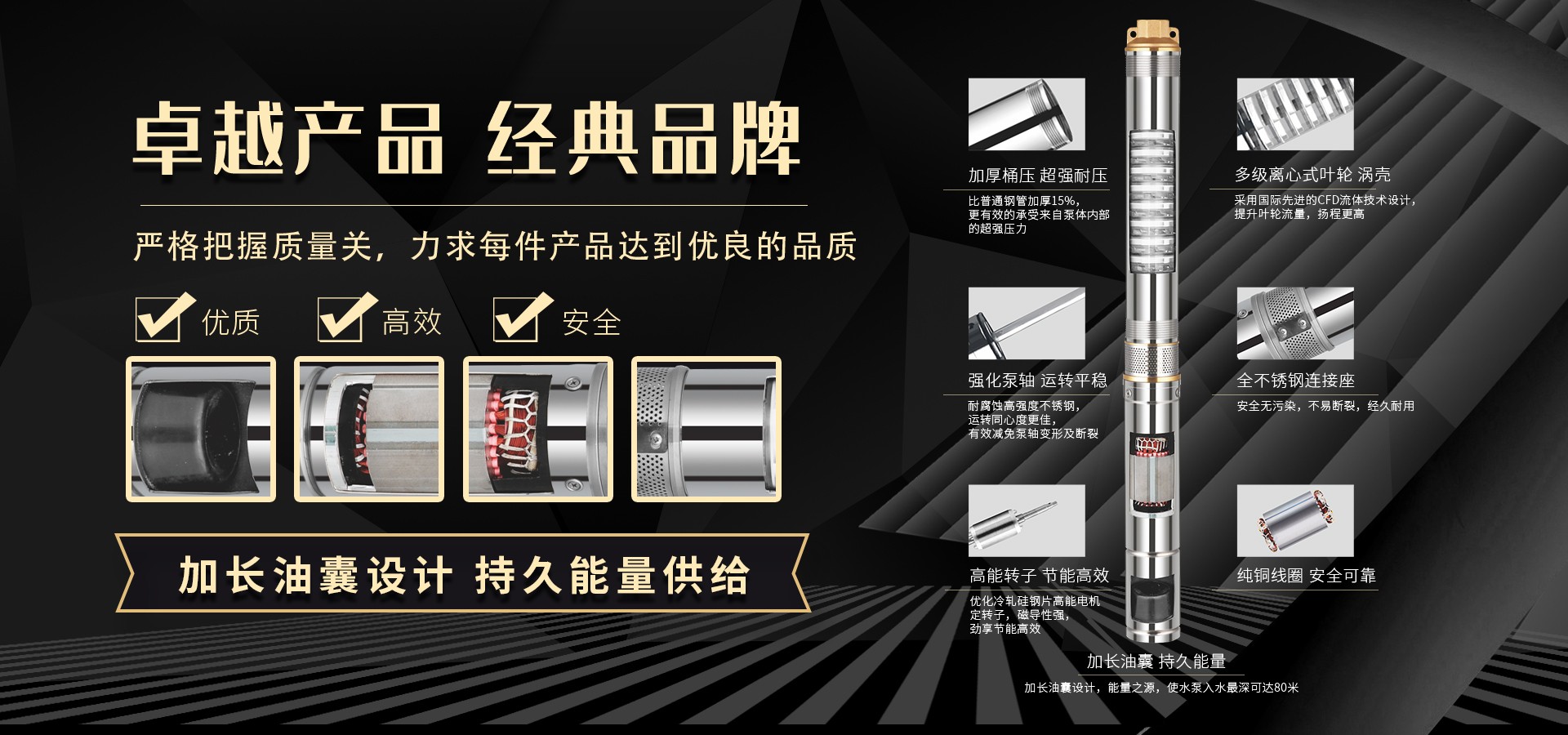 不僅僅是泵,更是流動(dòng)的科技。十多年來(lái),本公司堅(jiān)持走:以質(zhì)量求生存以科技創(chuàng)新求發(fā)展,重合同守信用的道路,生產(chǎn)經(jīng)營(yíng)得到迅速發(fā)展。更希望以后不管從發(fā)達(dá)城市到新農(nóng)村,從工業(yè)制造到尖端科技產(chǎn)業(yè)都隨處可見創(chuàng)江井泵的身影,創(chuàng)江深井泵已成為干萬(wàn)用戶心目中優(yōu)質(zhì)和信心的保證我們將以優(yōu)質(zhì)的產(chǎn)品和最完善的售后服務(wù)來(lái)真誠(chéng)與各界朋友開展廣泛的合作,共同創(chuàng)造一個(gè)美好的未來(lái)!